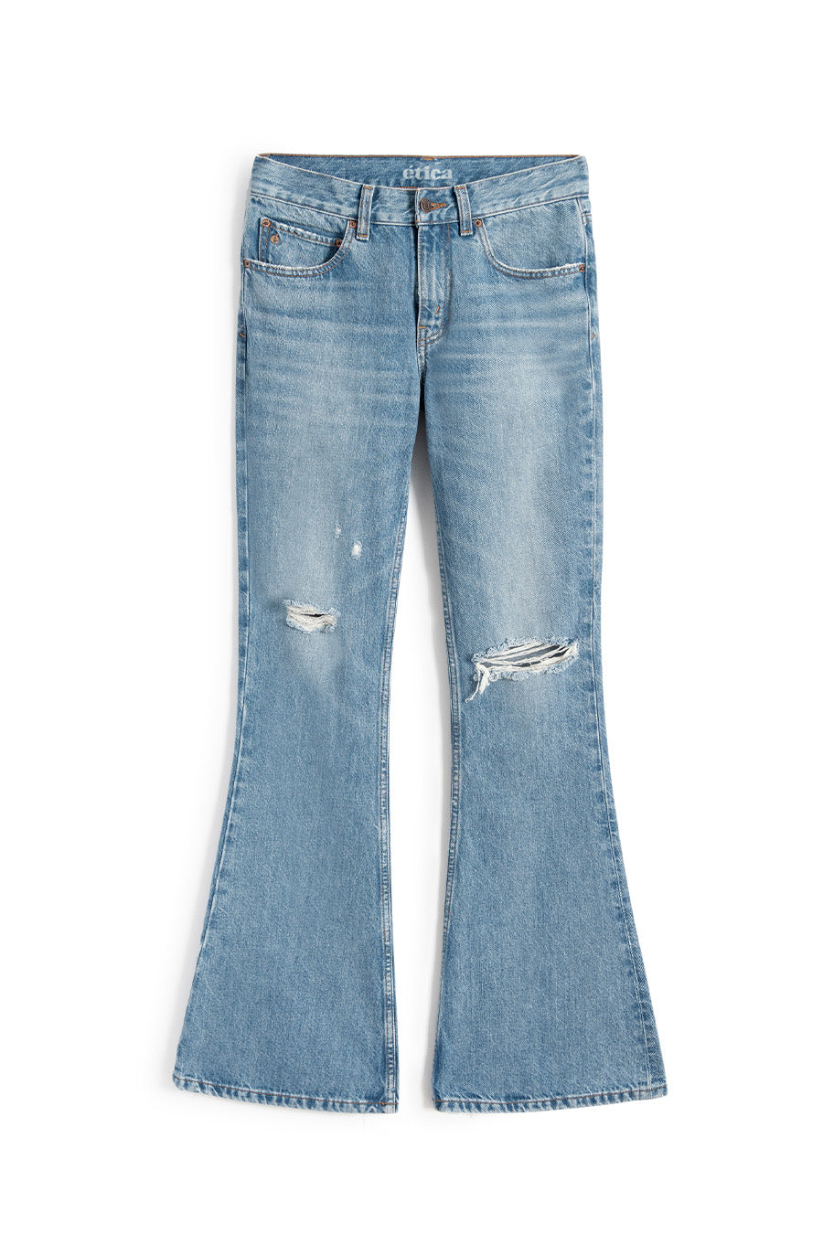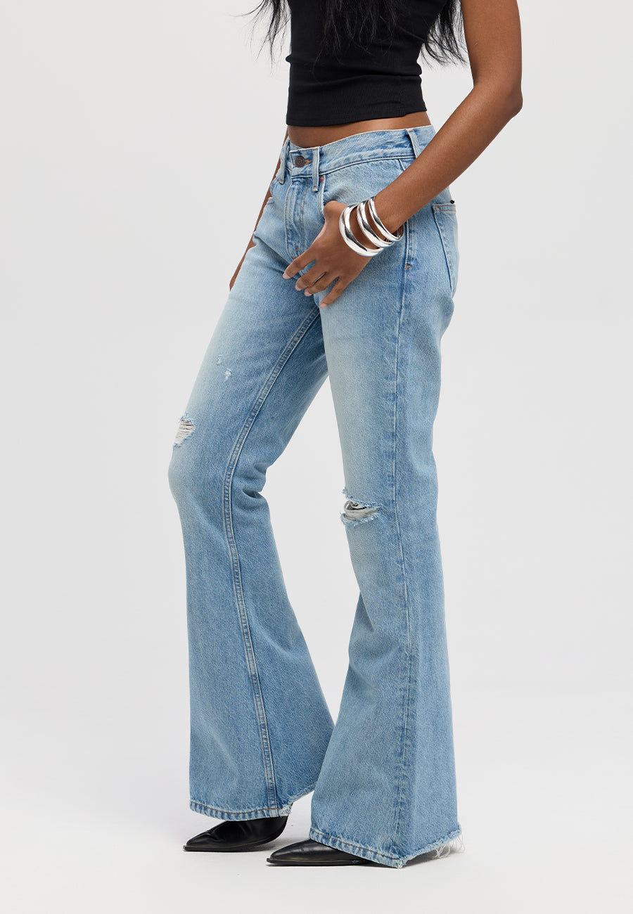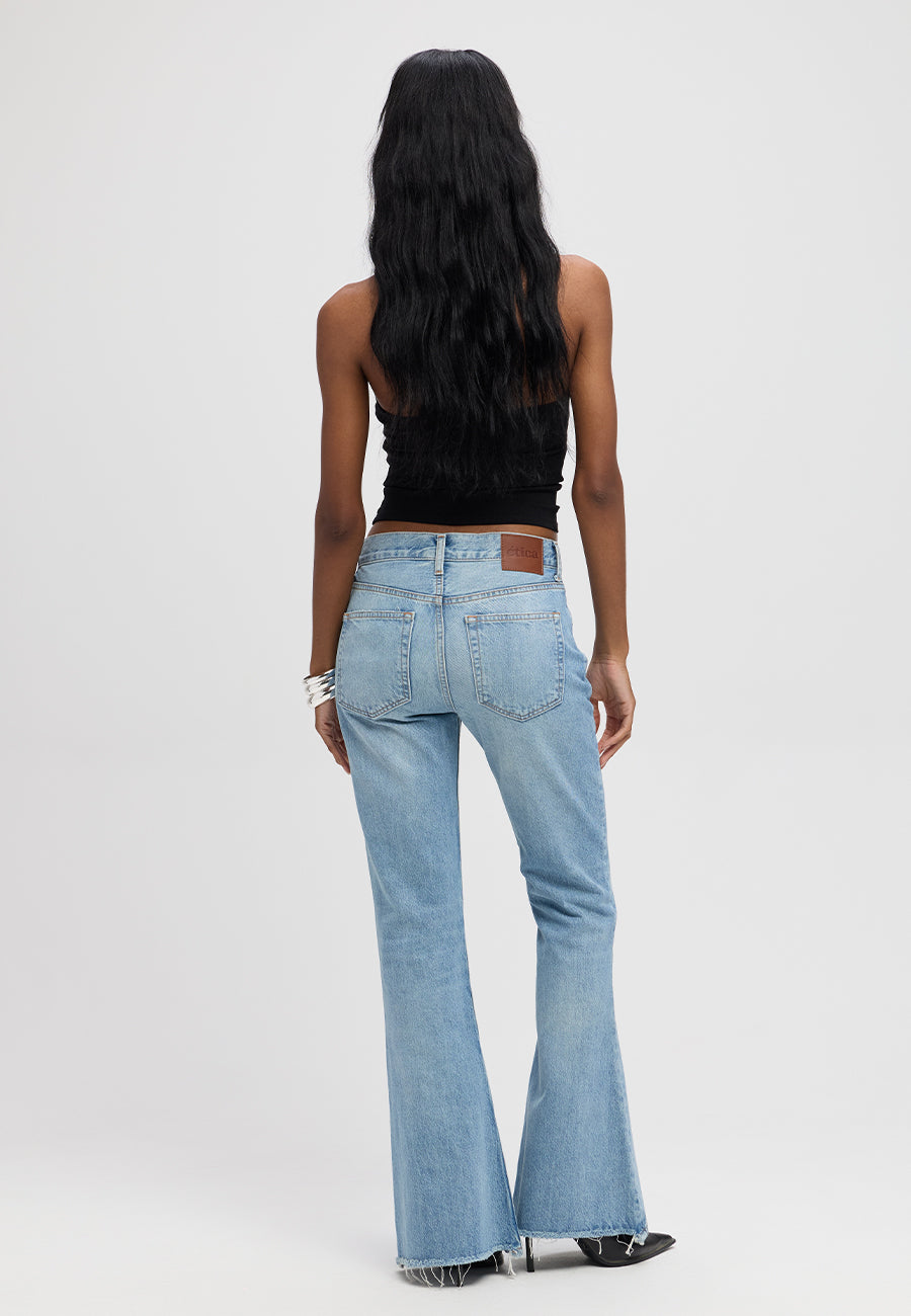 A modern flare with vintage soul. Designed by Atlanta, our new Creative Director, this sculptural silhouette blends the drama of a ’70s leg with the ease of a late-’90s rise. Made with minimal stretch for structure and shape, it hugs in all the right places and softens beautifully over time.