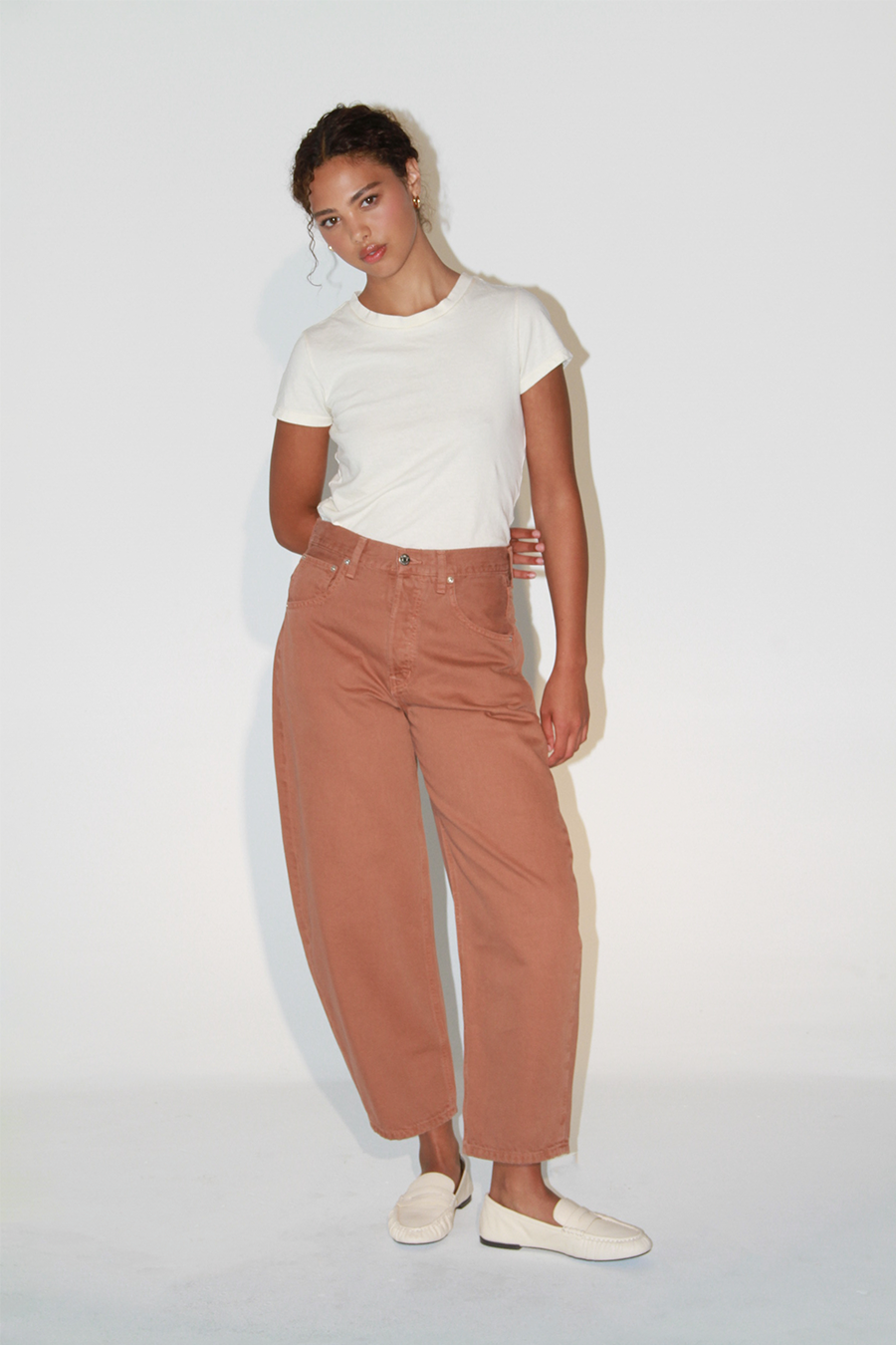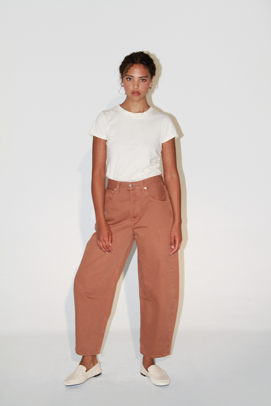The perfect barrel leg – sitting higher on the waist and extending into an exaggerated barrel leg. The ankle inseam is perfect to wear with sneakers, boots, or heels.