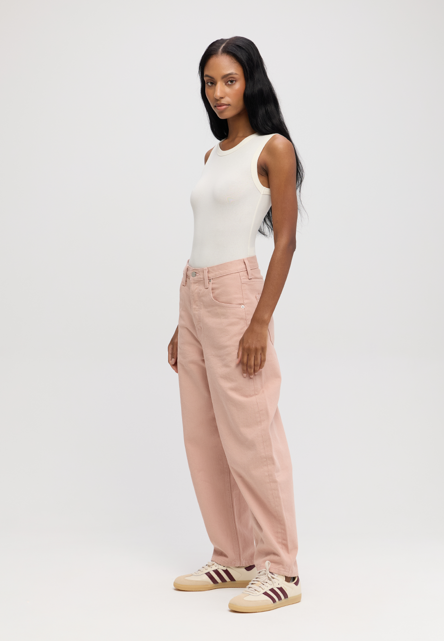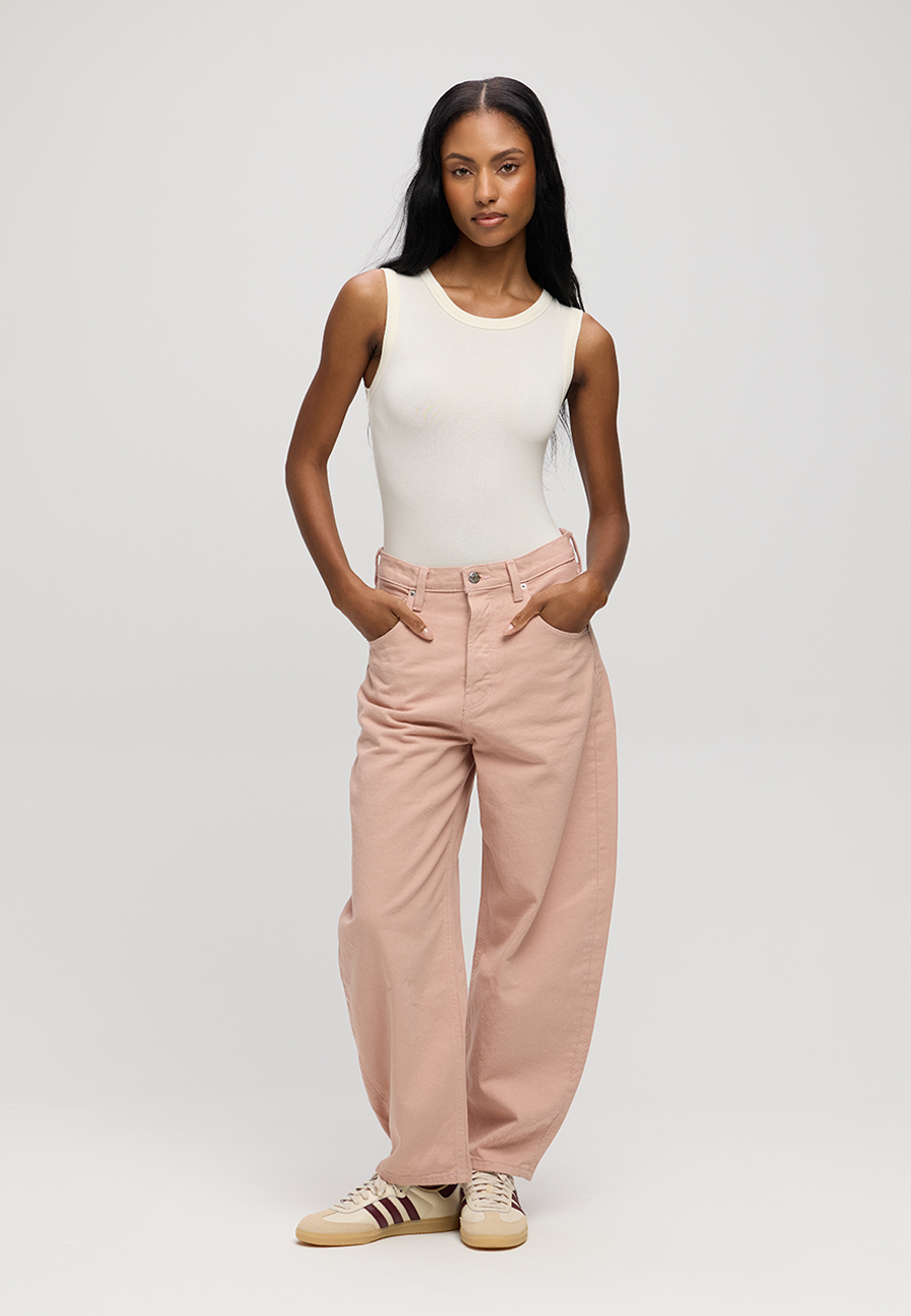 The perfect barrel leg – sitting higher on the waist and extending into an exaggerated barrel leg. The ankle inseam is perfect to wear with sneakers, boots, or heels.
