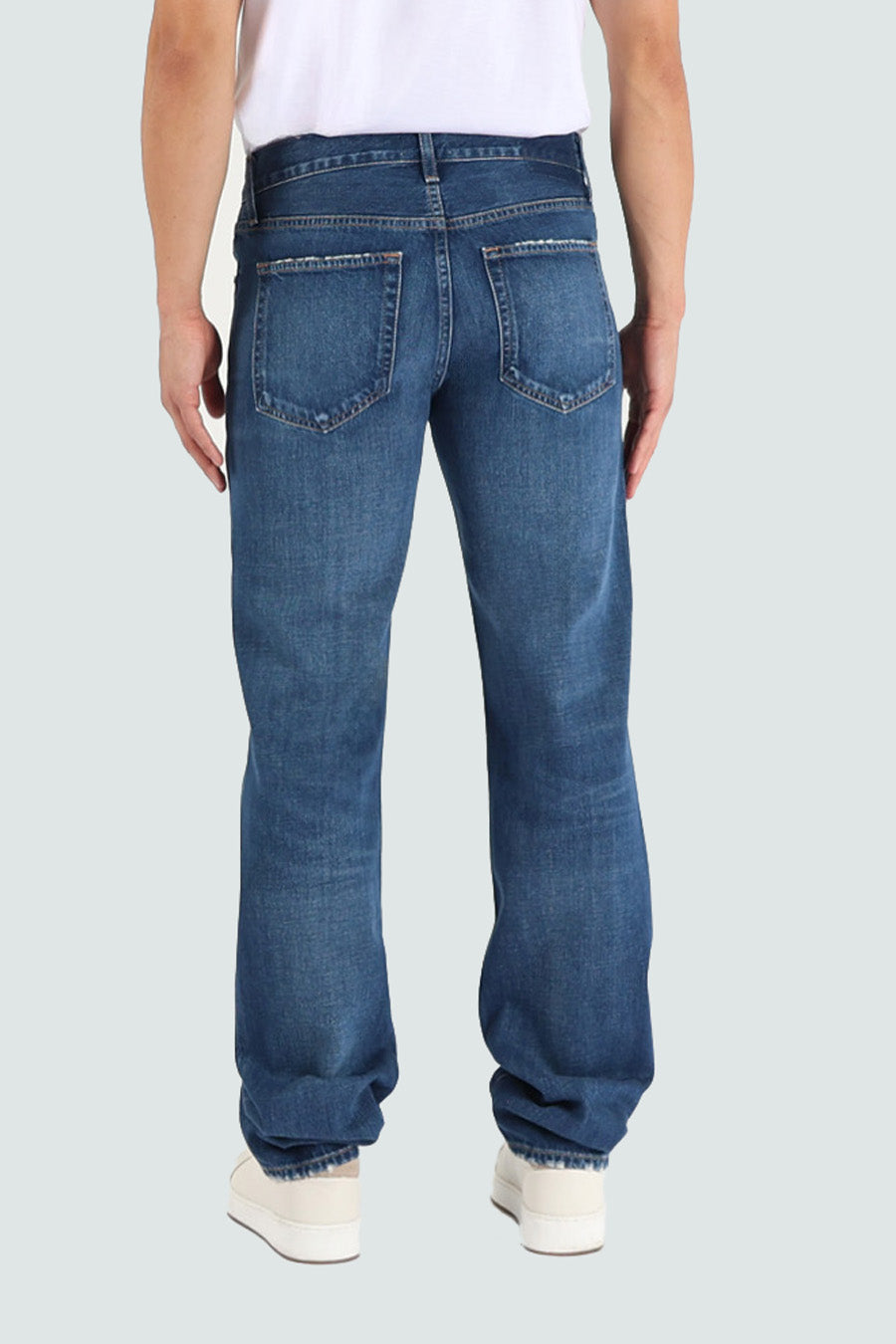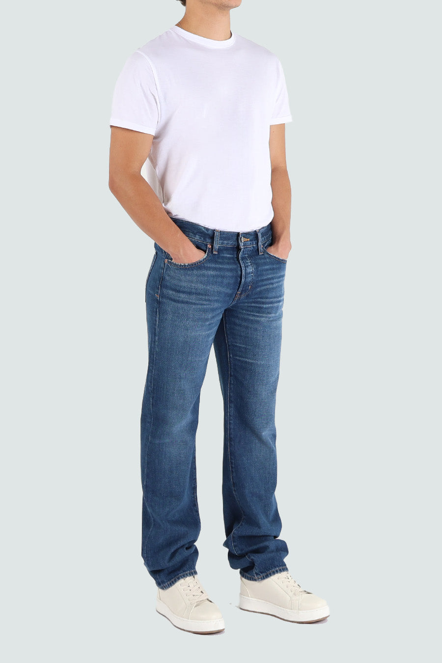 A classic straight leg jean featuring aA classic straight leg jean featuring a mid rise waist, 5 pocket details and button fly. It’s long inseam adds a slight stack at the ankle.
