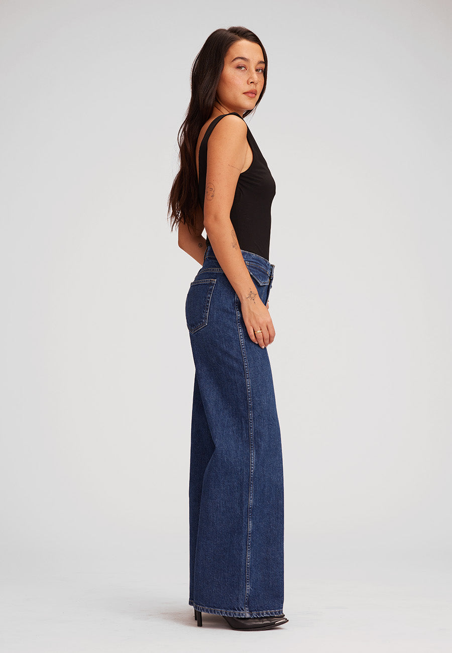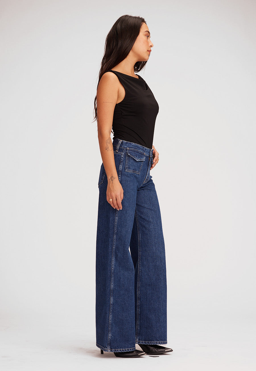 Romina features a mid rise with a softly fitted hip and a dramatic wide leg that creates a cool French girl vibe. 70’s patch pockets add a vintage inspired bohemian vibe.