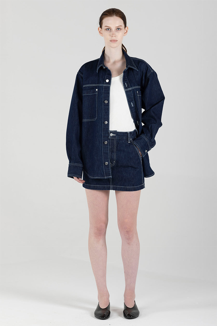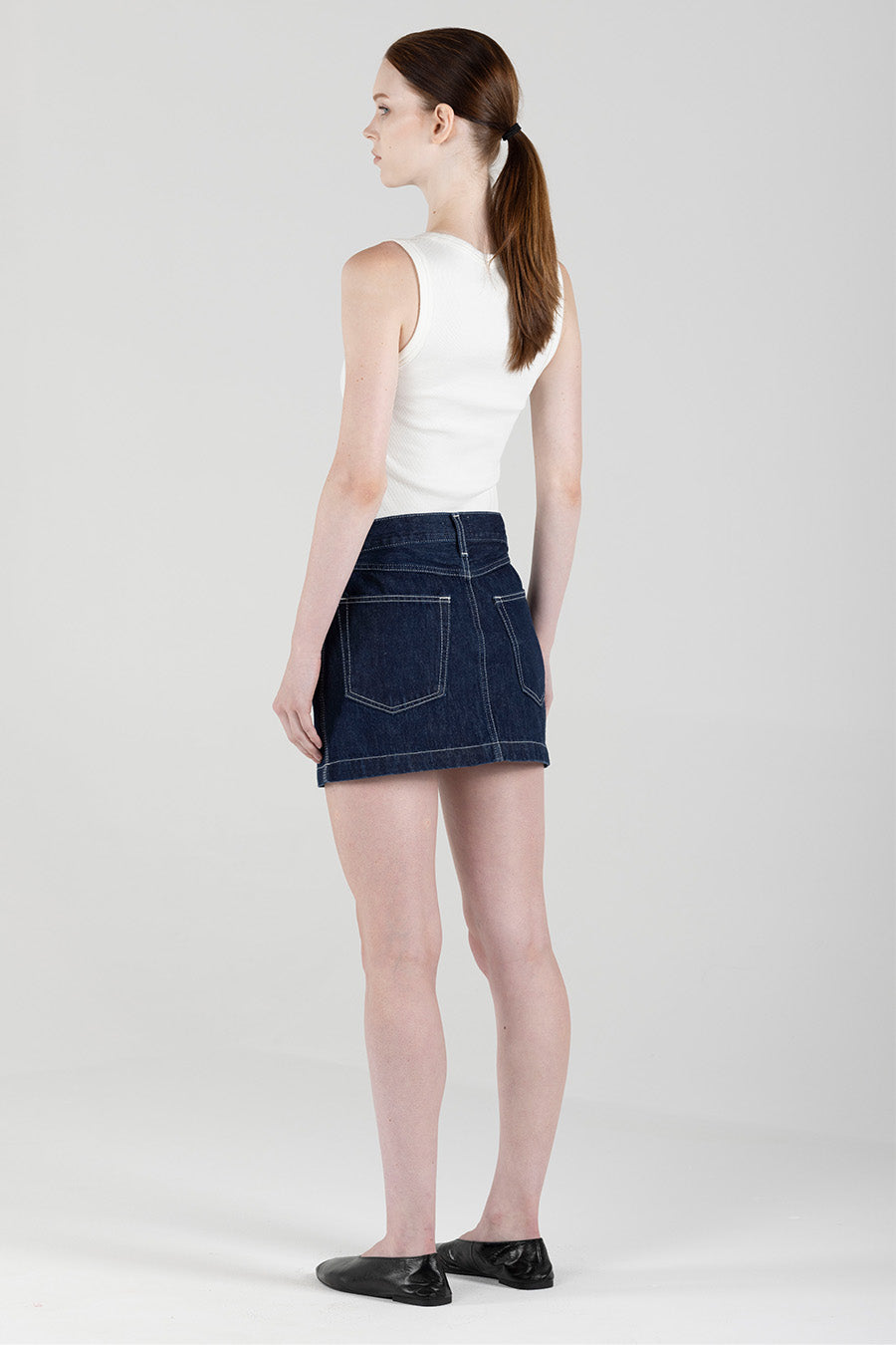 A sleek, polished mini skirt with trouser pockets, button fly and stylish utility inspired contrast top stitching.