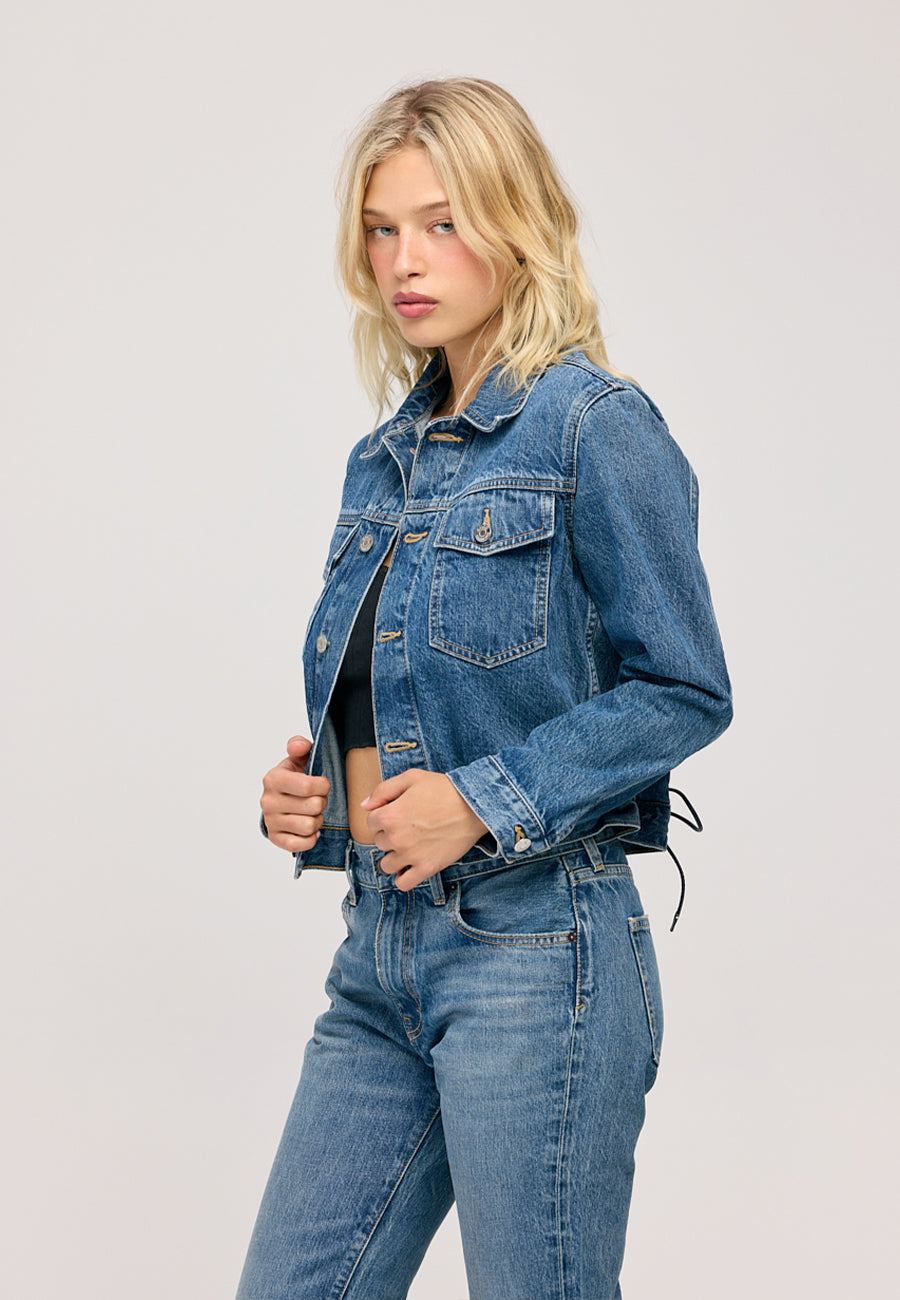 A classic denim jacket designed with a slightly fitted fit and cropped length for easy layering. The back is accented with lace up detailing to ensure you're always turning heads.