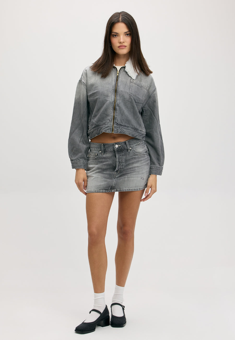 A cropped denim jacket with attitude. Fitted through the body with a shrunken shape, finished in washed Charcoal for a lived-in feel. A throwback piece that layers sharp and cool.