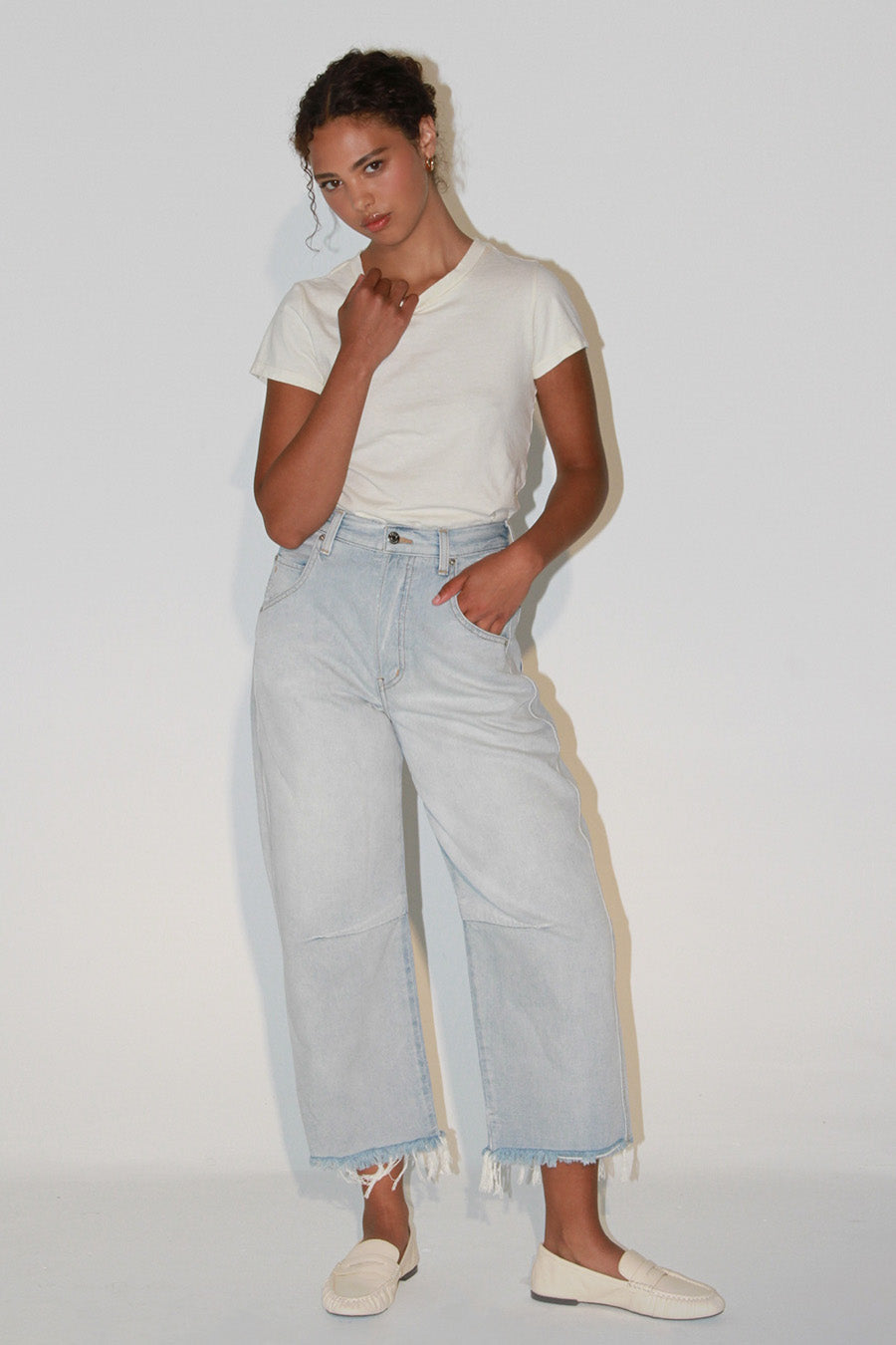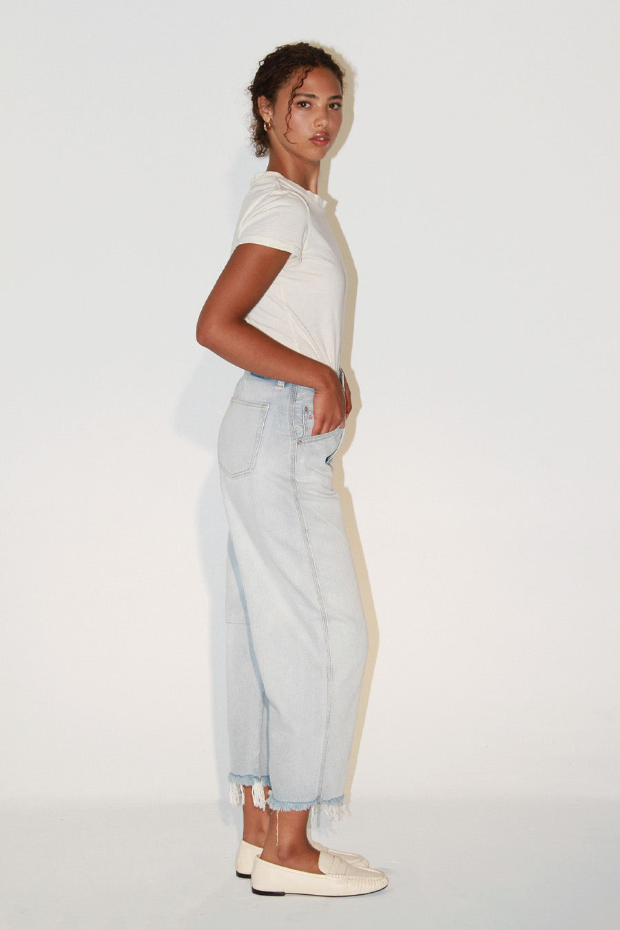 Quinn has a 13” high rise that sits easy through the hips and thigh but can be tightened with a hidden interior drawcord. It’s loose, arched leg is accentuated with an inseam knee dart. An authentic button fly and deep scoop pockets add to this a modern workwear look. An inseam of 26” and leg opening at 16” make it a perfect, versatile length for boots, sneakers or flats.